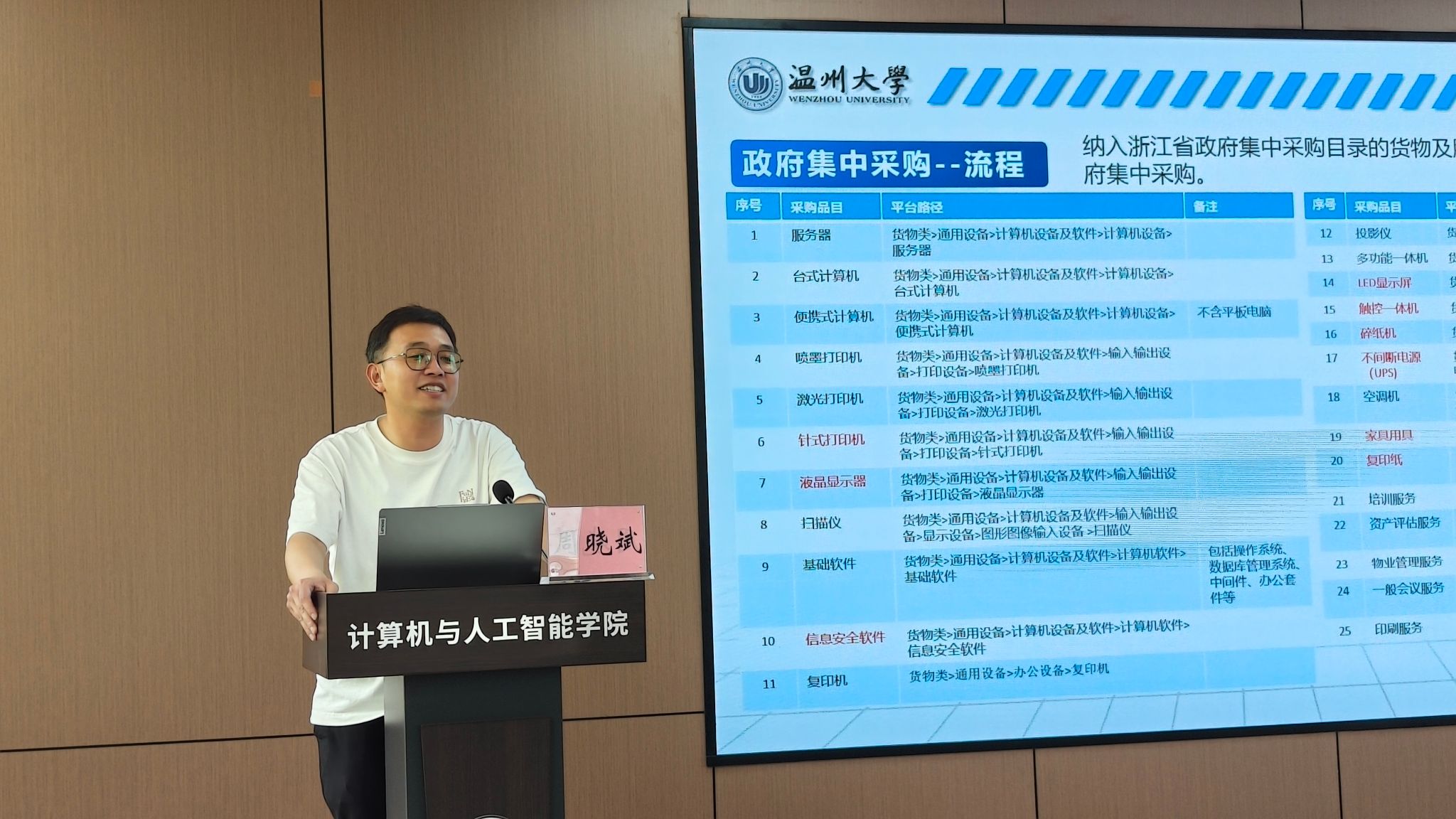 招标与采购中心周晓斌科长系统介绍了学校采购业务规范与流程。他从政府采购与非政府采购的区别入手,详细讲解了公开招标、竞争性谈判、单一来源采购等不同采购方式的适用情形及操作要点。针对采购过程中的风险防控,他特别强调要杜绝“程序倒置”和“化整为零规避招标”等违规行为,并提醒教职工在单一来源采购时必须严格履行专家论证和公示程序。