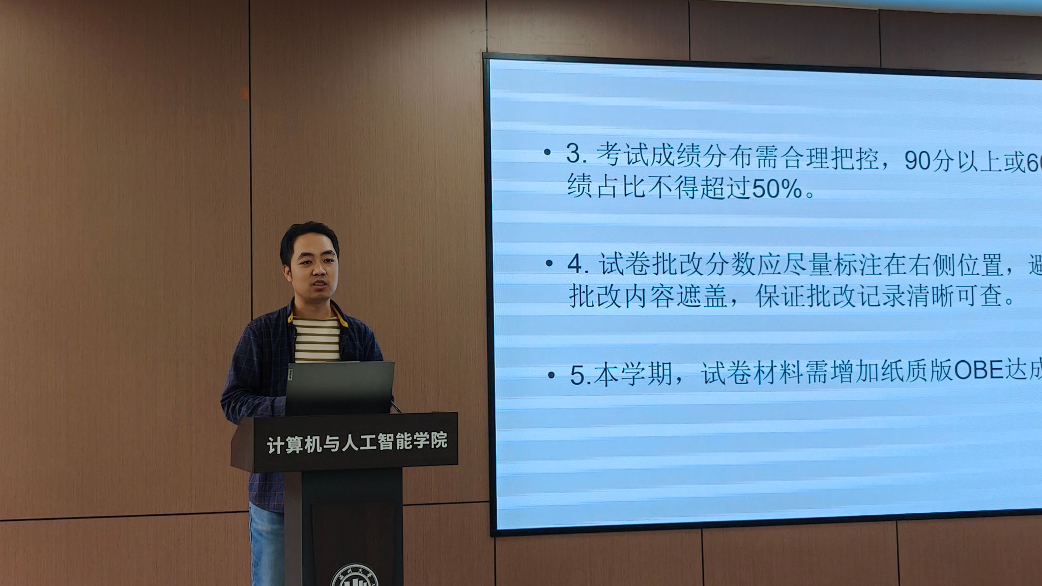 在教学规范方面,学术副院长张楠结合校督导反馈意见,重点强调了试卷批改规范性、成绩分布合理性等教学细节问题。围绕即将开展的中期教学检查、本科教育教学审核评估等工作,张院长从课程思政建设、毕业论文指导等关键环节提出了明确要求,为提升教学质量提供了具体指引。