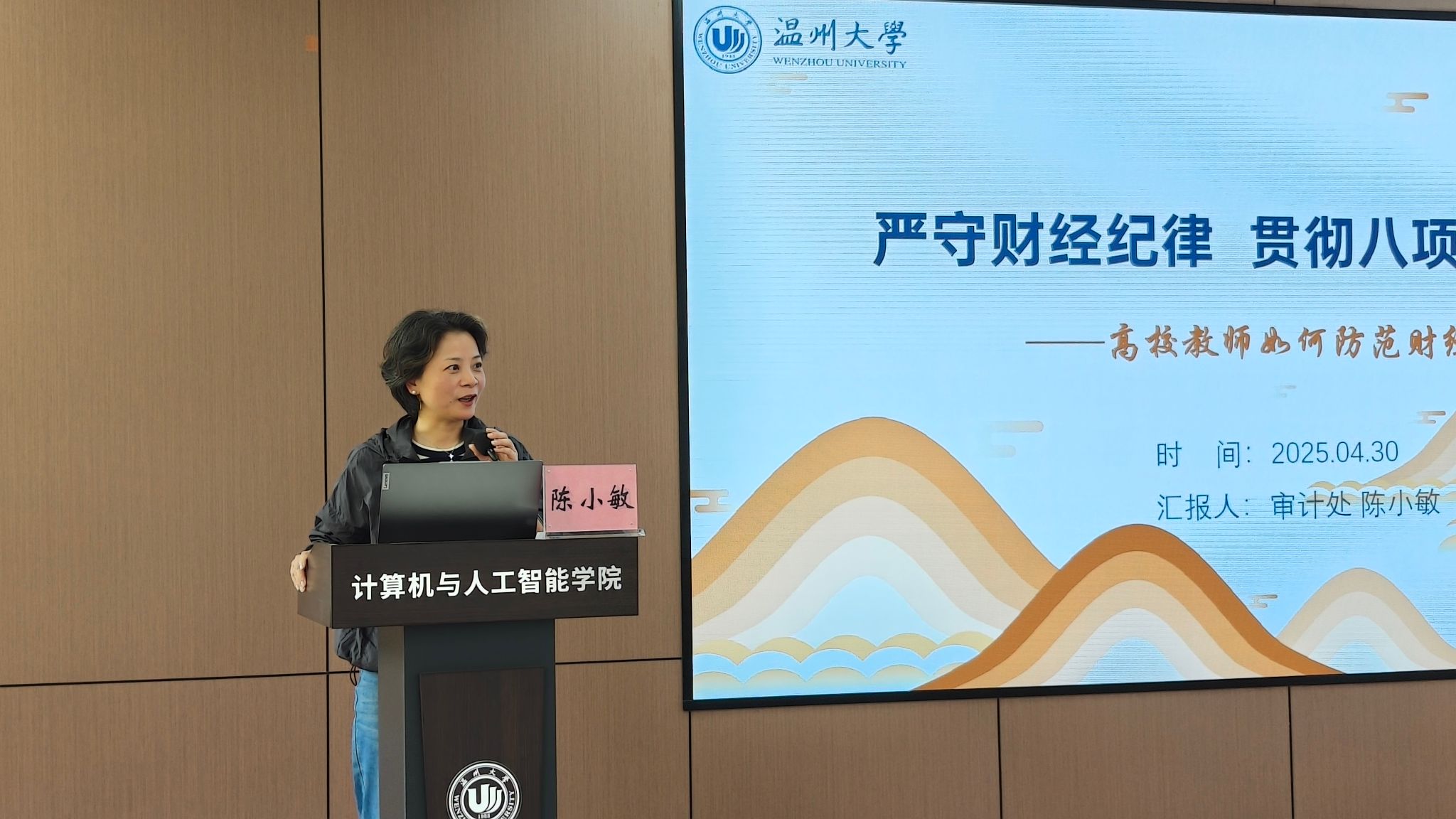 审计处处长陈小敏以《严守财经纪律,贯彻八项规定精神》为题,结合近年来高校频发的财务违规案例,深入剖析了科研经费使用、公务接待、劳务费发放等方面的风险点。她通过虚开发票、套取经费等典型案例,警示教职工务必做到票据真实、审批规范、开支合理,同时建议教师定期核对项目预算,留存完整证据链,从源头防范财务风险。