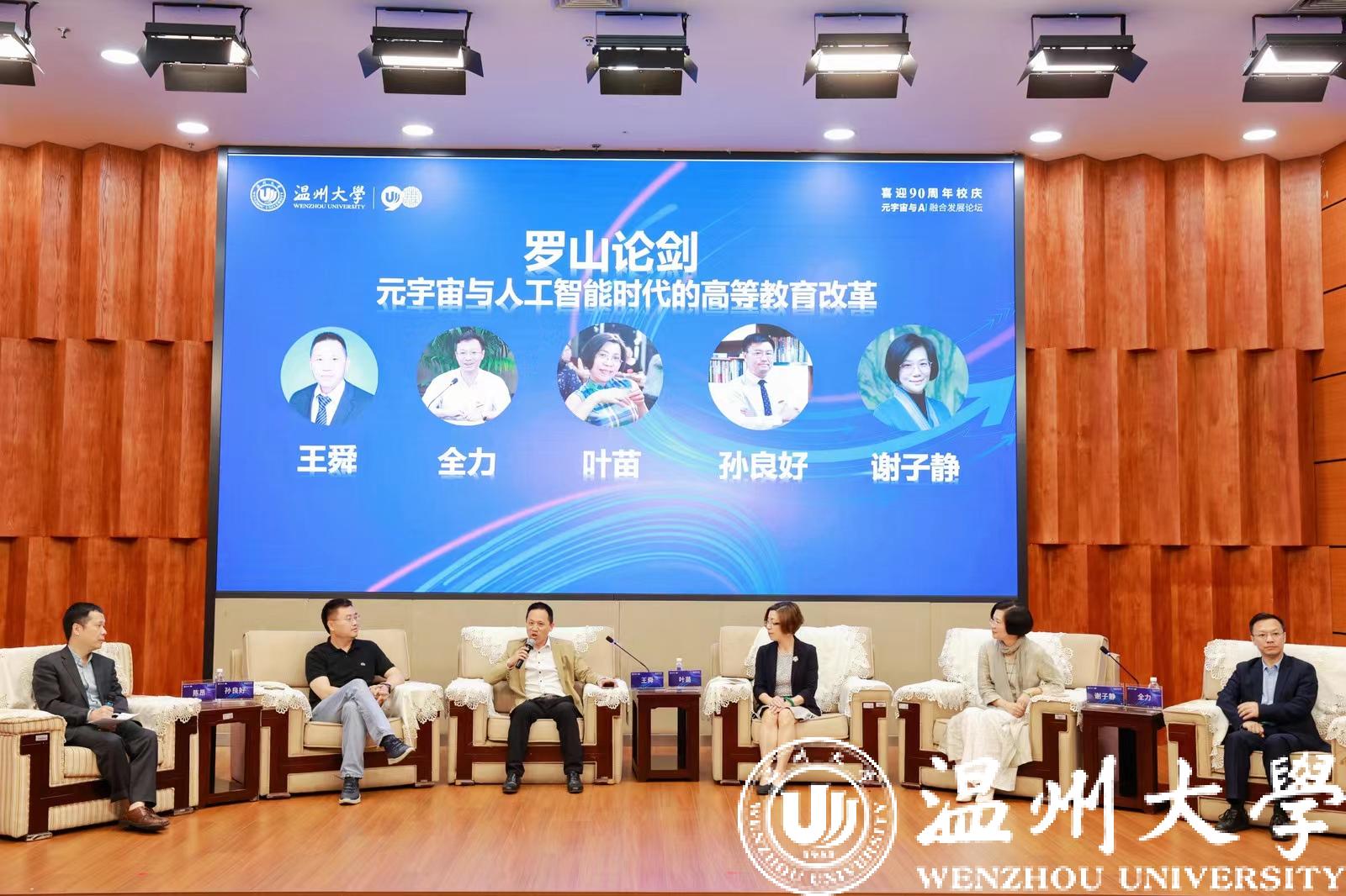 时值温州大学90周年校庆,温州大学副校长王舜、98堂 、温州大学美术与设计学院院长、温州大学人文学院、温州大学外国语学院负责人在以“元宇宙与人工智能时代的高等教育改革”为主题的罗山论剑环节就温州大学如何布局元宇宙与AI领域,共畅元宇宙与AI相关话题,共话温大智能未来。