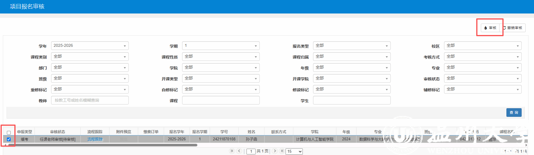 功能路径:信息维护-项目报名审核-勾选对应课程后点击审核