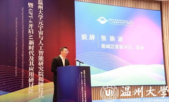 张崇波在致辞中表示:温州大学作为浙南闽北赣东区域唯一的综合性大学,师资实力雄厚、创新成果显著,为温州打造区域性人才科创高地提供了坚强支撑。温州大学元宇宙与人工智能研究院是温州大学和鹿城区校地合作共建的新型研发机构,希望双方能以揭牌仪式为新起点,围绕人工智能、区块链、大数据等新兴领域,加强校地合作、深化产学研融合、聚力携手共赢,进一步放大“创业创富在鹿城”发展优势,推动更多科研成果转化、科创企业孵化和创新人才培养。鹿城区将拿出最大诚意,全力支持研究院开展各项工作,共同努力开创校地合作共赢新典范。希望各位院士专家多到鹿城开展学术交流,为鹿城产业发展把脉问诊。